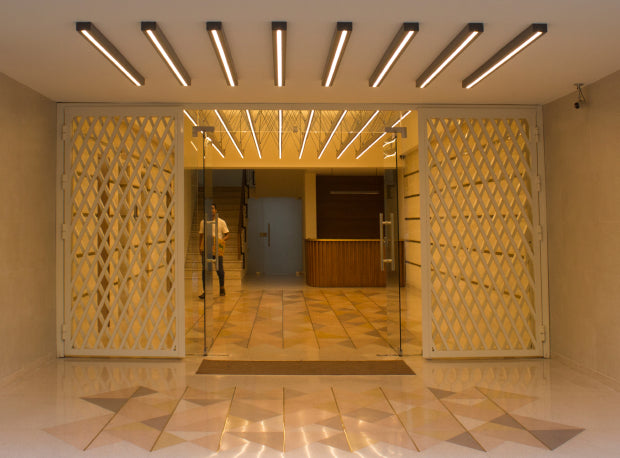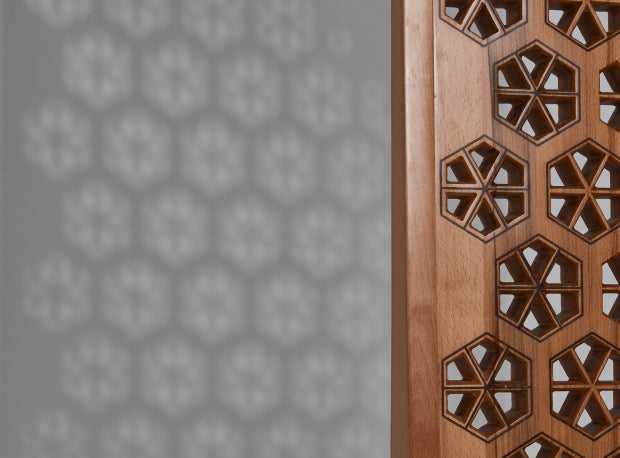 While designing for a client’s home in Qanawat, Old Damascus, we noticed a traditional motif incorporated in the master bedroom.This motif was used as the carving pattern on a new lamp for the client and launched a new series of carved wooden lamps.The Qanawat Globe is the first in the series which are named after the location where each piece’s pattern motif is found. Each lamp goes through numerous stages and techniques to be carved and are either finished in matte white or natural Beech wood exterior, while the inside receives gold leaf treatment.