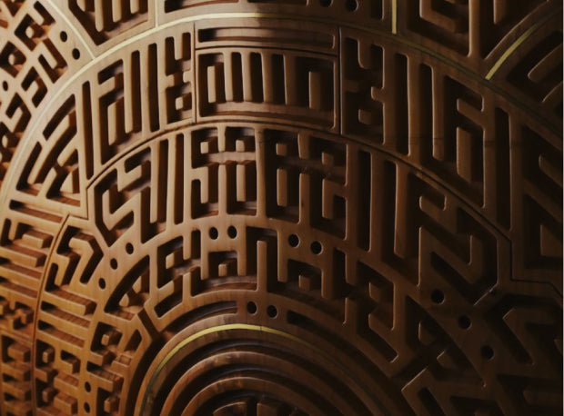The Calligraphy Table, as much of DAMJ’s work, is a custom piece made to order. The intention was to use the client’s preferred phrase as the feature for their living room coffee table. The arabic phrase was drawn by a traditional calligrapher in a circular arrangement so as to complement the radial live-edge Iroko slab chosen by the client. The lettering is carved in Oak and inset using a reverse-carve of the slab to achieve a perfect hand-in-glove fit. The table legs are made from steel rods in a triangulated pentagonal arrangement.